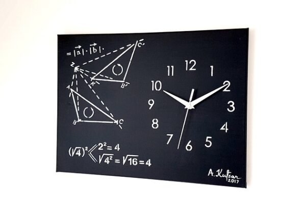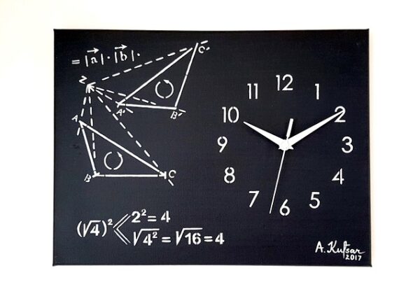 Käsitööna valminud seinakell alusraamiga lõuendil. Kell on vaikse ja sujuva sekundiosutiga, töötab ühe AA patareiga, mis kuulub komplekti.