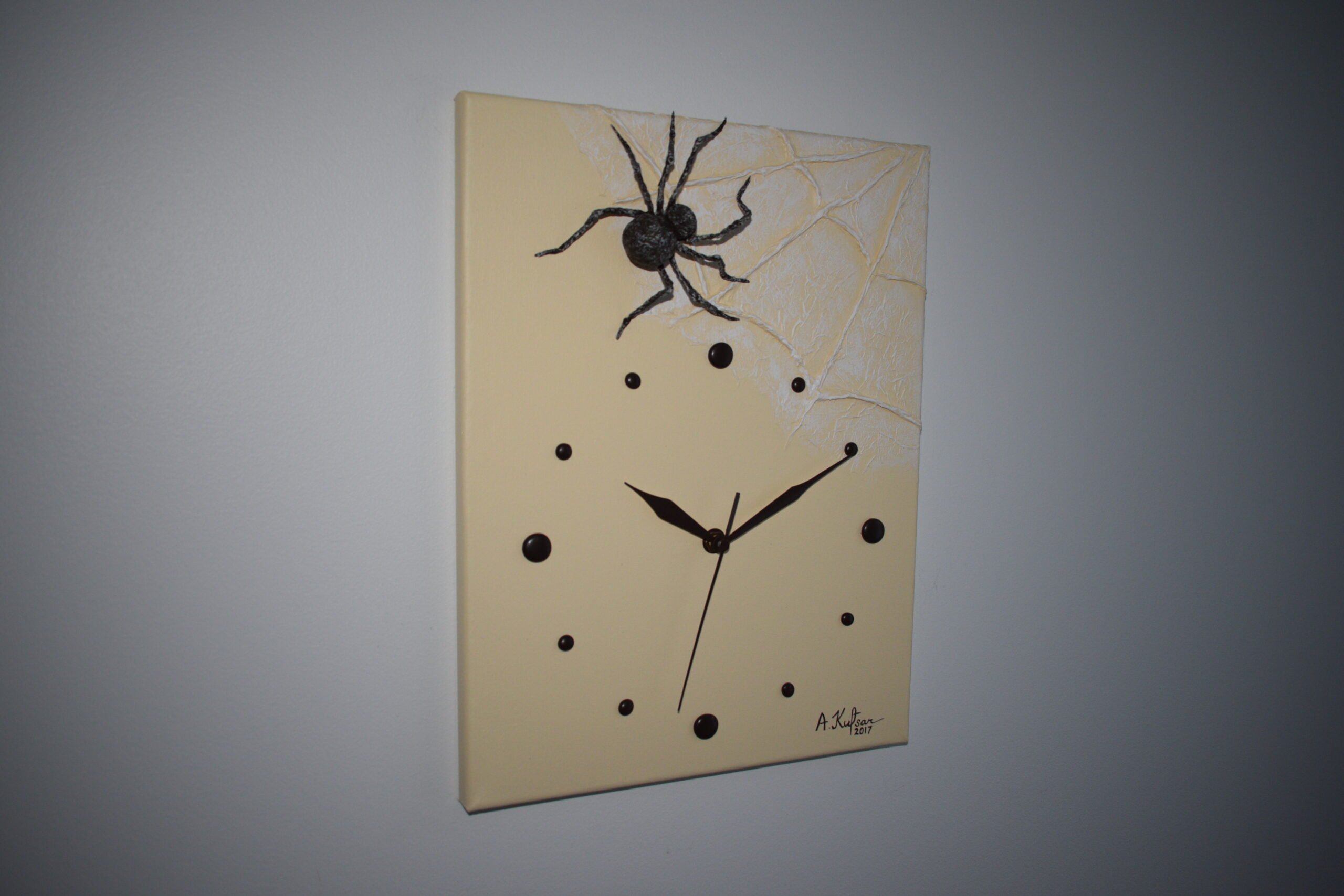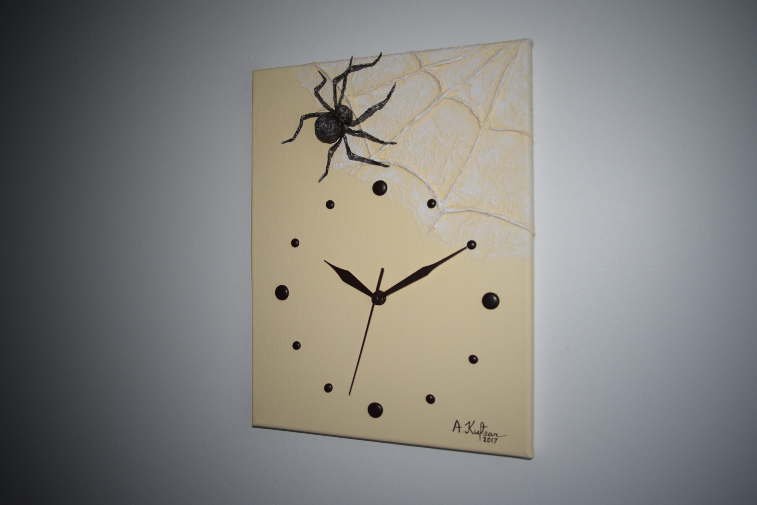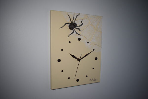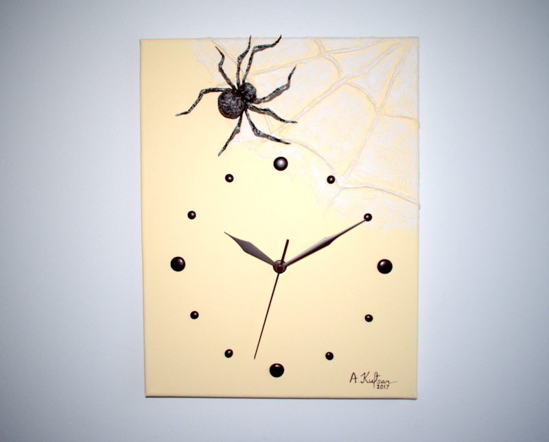 Käsitööna valminud 3D seinakell alusraamiga lõuendil. Kell on vaikse ja sujuva sekundiosutiga, töötab ühe AA patareiga, mis kuulub komplekti.